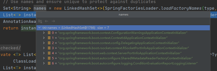 Set<String> names = new LinkedHashSet<>(SpringFactoriesLoader.loadFactoryNames(type, classLoader));